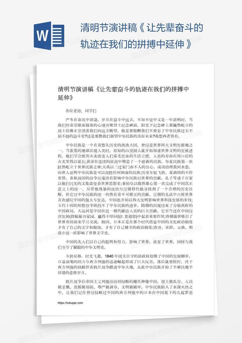 本作品为清明节演讲稿《让先辈奋斗的轨迹在我们的拼搏中延伸》, 编号:k1b2kge4m1, 格式为 docx, 大小1 MB, 本作品下载后,先解压,解压之后用推荐软件 Word(2010) 打开, 然后进行编辑功能。