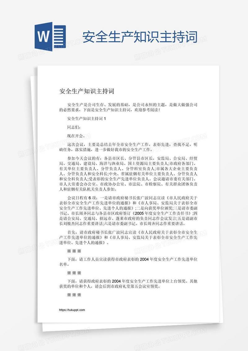 本作品为安全生产知识主持词, 编号:k1b2klddm1, 格式为 docx, 大小1 MB, 本作品下载后,先解压,解压之后用推荐软件 Word(2010) 打开, 然后进行编辑功能。