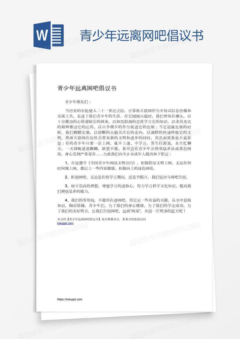 本作品为青少年远离网吧倡议书, 编号:k1b2klojd1, 格式为 docx, 大小1 MB, 本作品下载后,先解压,解压之后用推荐软件 Word(2010) 打开, 然后进行编辑功能。