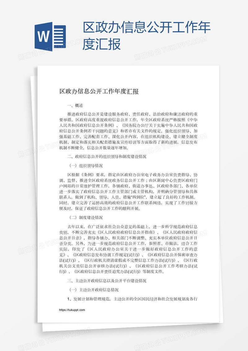 本作品为区政办信息公开工作年度汇报, 编号:k1b2kqglp1, 格式为 docx, 大小1 MB, 本作品下载后,先解压,解压之后用推荐软件 Word(2010) 打开, 然后进行编辑功能。