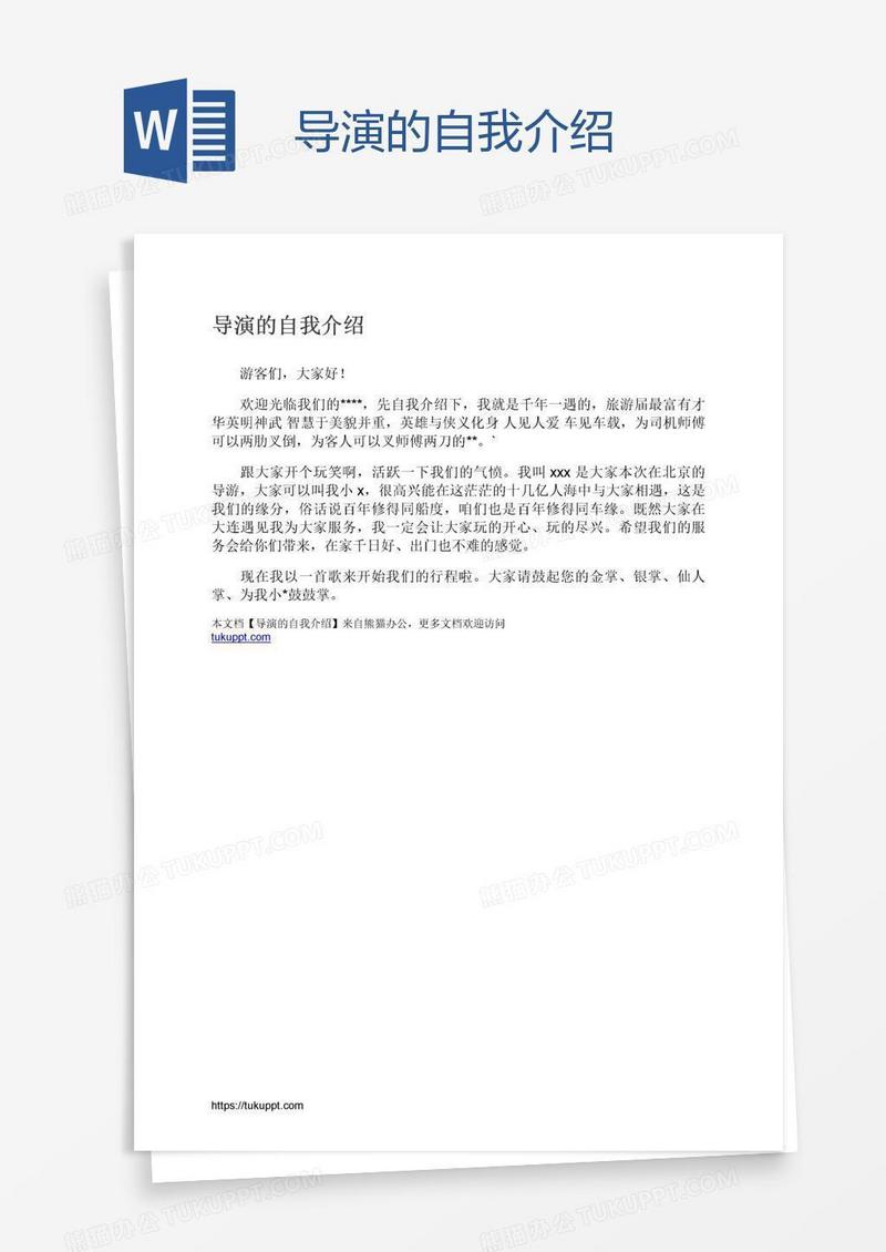本作品为导演的自我介绍, 编号:k1b2krldp1, 格式为 docx, 大小1 MB, 本作品下载后,先解压,解压之后用推荐软件 Word(2010) 打开, 然后进行编辑功能。