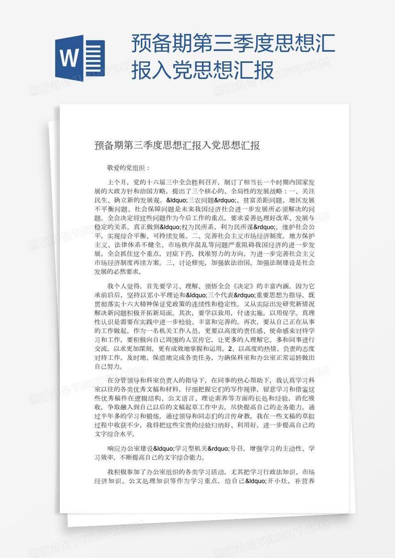 本作品为预备期第三季度思想汇报, 编号:k1b2rjgob1, 格式为 docx, 大小1 MB, 本作品下载后,先解压,解压之后用推荐软件 Word(2010) 打开, 然后进行编辑功能。