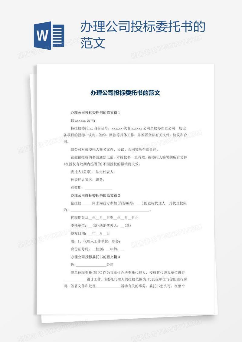 本作品为办理公司投标委托书的范文, 编号:k1b2rw7g81, 格式为 docx, 大小1 MB, 本作品下载后,先解压,解压之后用推荐软件 Word(2010) 打开, 然后进行编辑功能。