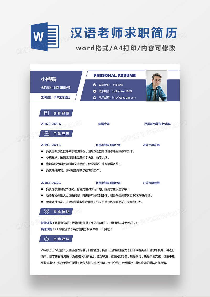 本作品为蓝色简约汉语老师求职简历WORD模板, 编号:k1b2ryv881, 格式为 docx, 大小1 MB, 本作品下载后,先解压,解压之后用推荐软件 Word(2019) 打开, 然后进行编辑功能。