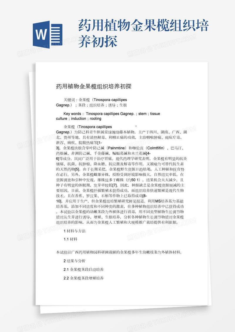 本作品为药用植物金果榄组织培养初探, 编号:k1n233j051, 格式为 docx, 大小1 MB, 本作品下载后,先解压,解压之后用推荐软件 Word(2010) 打开, 然后进行编辑功能。
