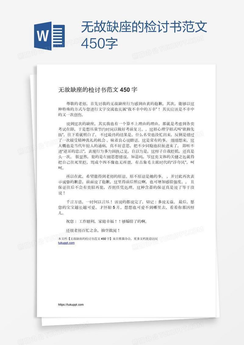 本作品为无故缺座的检讨书范文450字, 编号:k1n2m2d6p1, 格式为 docx, 大小1 MB, 本作品下载后,先解压,解压之后用推荐软件 Word(2010) 打开, 然后进行编辑功能。