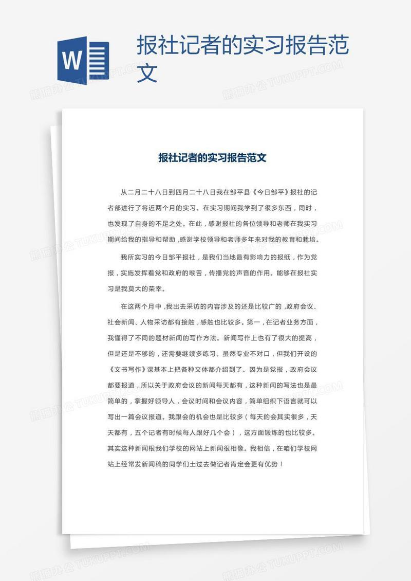 本作品为报社记者的实习报告范文, 编号:k1n2m6k0n1, 格式为 docx, 大小1 MB, 本作品下载后,先解压,解压之后用推荐软件 Word(2010) 打开, 然后进行编辑功能。