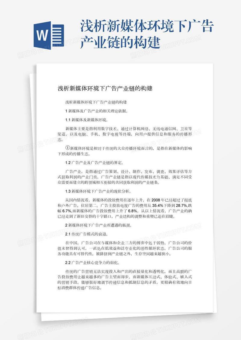 本作品为浅析新媒体环境下广告产业链的构建, 编号:k1n2mer841, 格式为 docx, 大小1 MB, 本作品下载后,先解压,解压之后用推荐软件 Word(2010) 打开, 然后进行编辑功能。