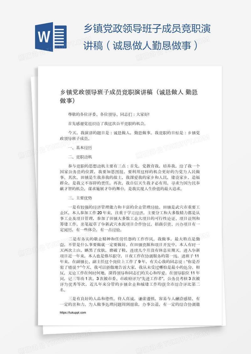 本作品为乡镇党政领导班子成员竞职演讲稿(诚恳做人勤恳做事), 编号:k1n2mgqlp1, 格式为 docx, 大小1 MB, 本作品下载后,先解压,解压之后用推荐软件 Word(2010) 打开, 然后进行编辑功能。