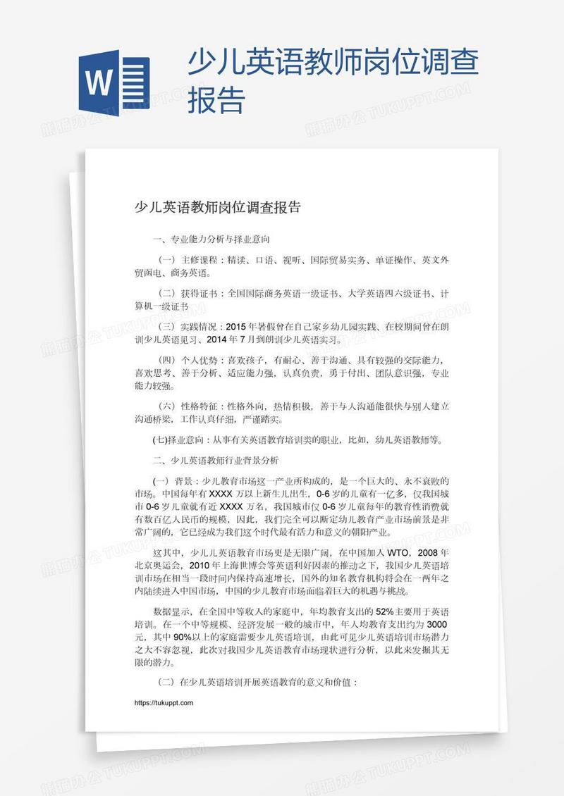 本作品为少儿英语教师岗位调查报告, 编号:k1n2mnj751, 格式为 docx, 大小1 MB, 本作品下载后,先解压,解压之后用推荐软件 Word(2010) 打开, 然后进行编辑功能。