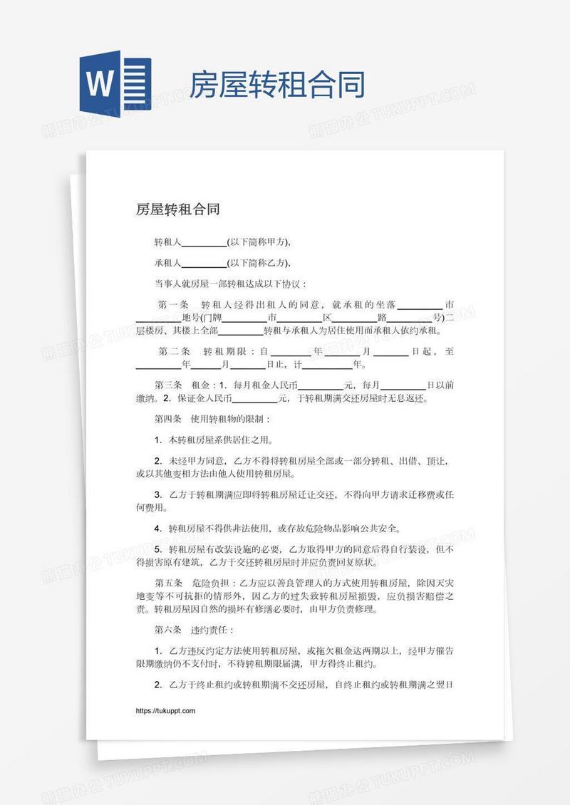 本作品为房屋转租合同, 编号:k1n2mno041, 格式为 docx, 大小1 MB, 本作品下载后,先解压,解压之后用推荐软件 Word(2010) 打开, 然后进行编辑功能。