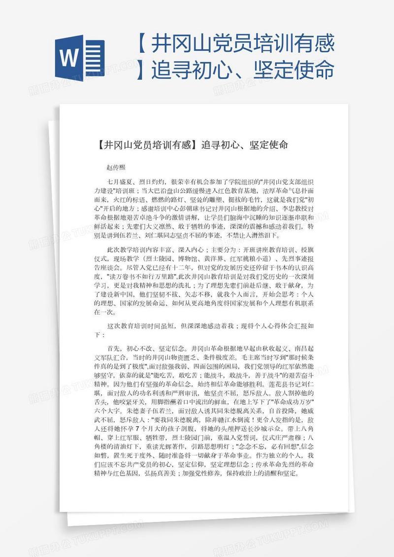 本作品为【井冈山党员培训有感】追寻初心、坚定使命, 编号:k1n2mw6dq1, 格式为 docx, 大小1 MB, 本作品下载后,先解压,解压之后用推荐软件 Word(2010) 打开, 然后进行编辑功能。