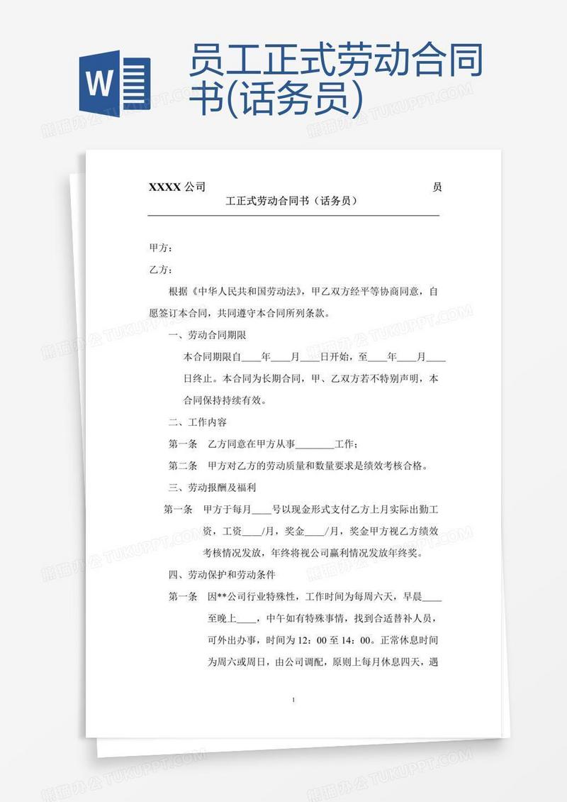 本作品为员工正式劳动合同书(话务员), 编号:k1n2n6e441, 格式为 doc, 大小1 MB, 本作品下载后,先解压,解压之后用推荐软件 Word(2010) 打开, 然后进行编辑功能。