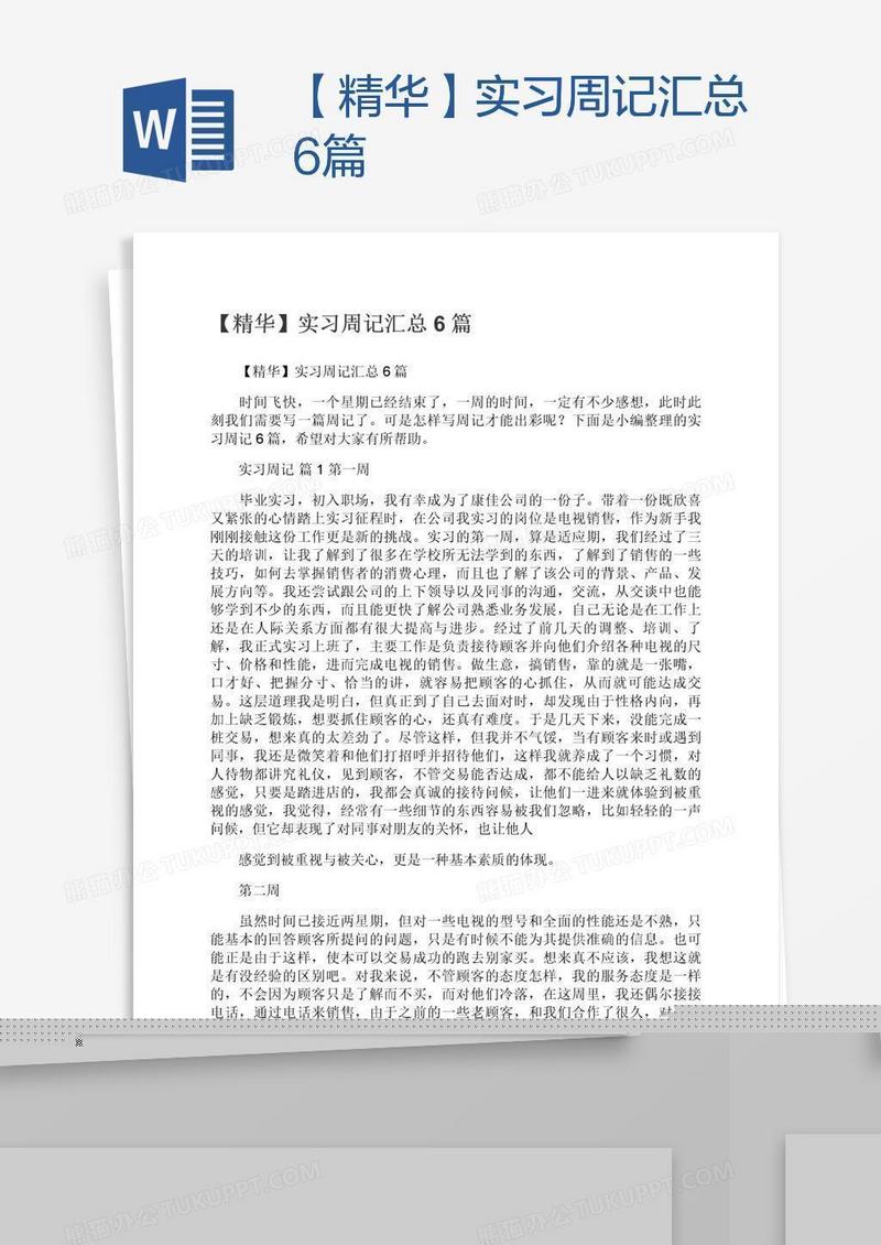 本作品为【精华】实习周记汇总6篇, 编号:k1n2n7e4n1, 格式为 docx, 大小1 MB, 本作品下载后,先解压,解压之后用推荐软件 Word(2010) 打开, 然后进行编辑功能。