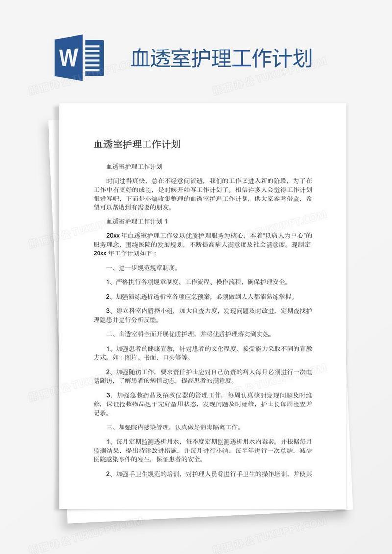 本作品为血透室护理工作计划, 编号:k1n2n7ogp1, 格式为 docx, 大小1 MB, 本作品下载后,先解压,解压之后用推荐软件 Word(2010) 打开, 然后进行编辑功能。