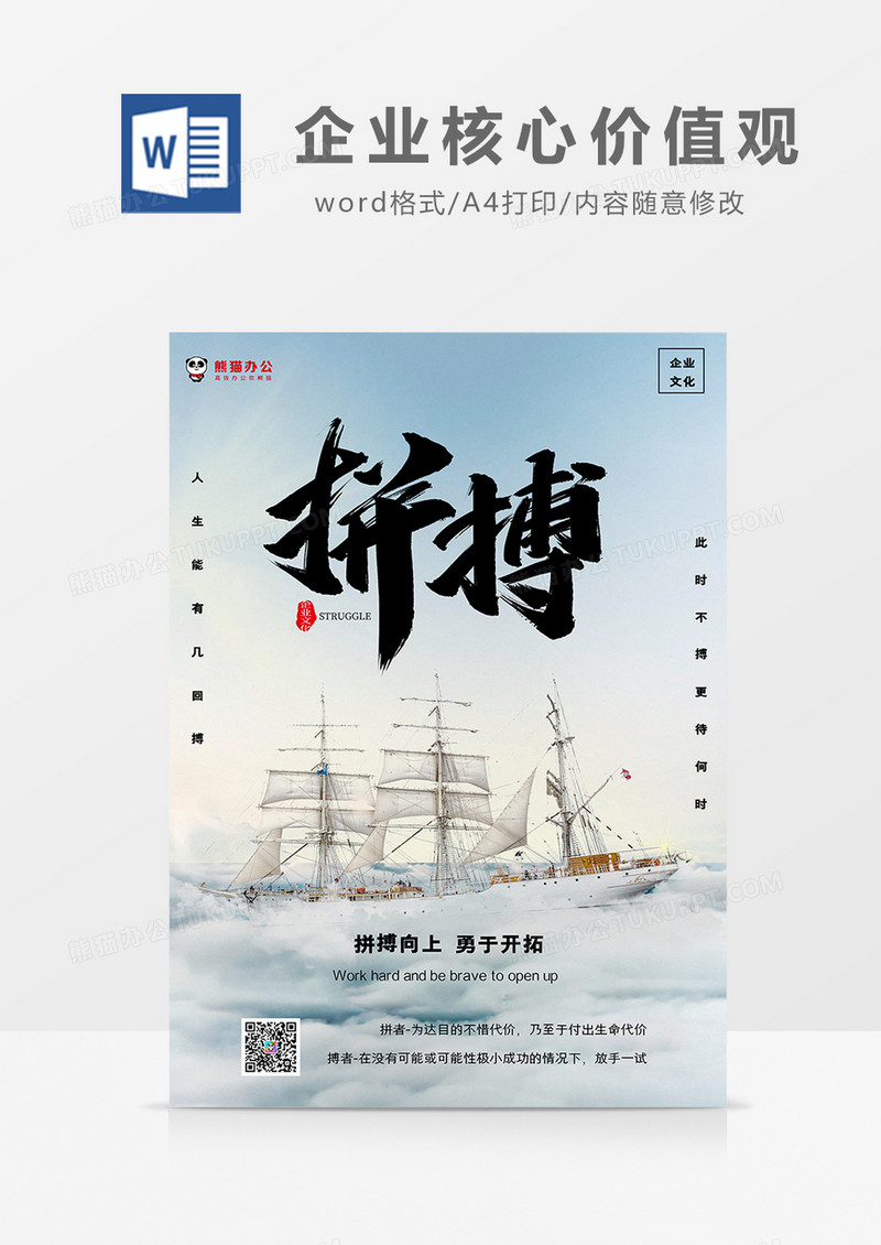 本作品为浅蓝简约风企业核心价值观—拼搏海报Word模板, 编号:k1n2ne3451, 格式为 docx, 大小4 MB, 本作品下载后,先解压,解压之后用推荐软件 Word(2016) 打开, 然后进行编辑功能。