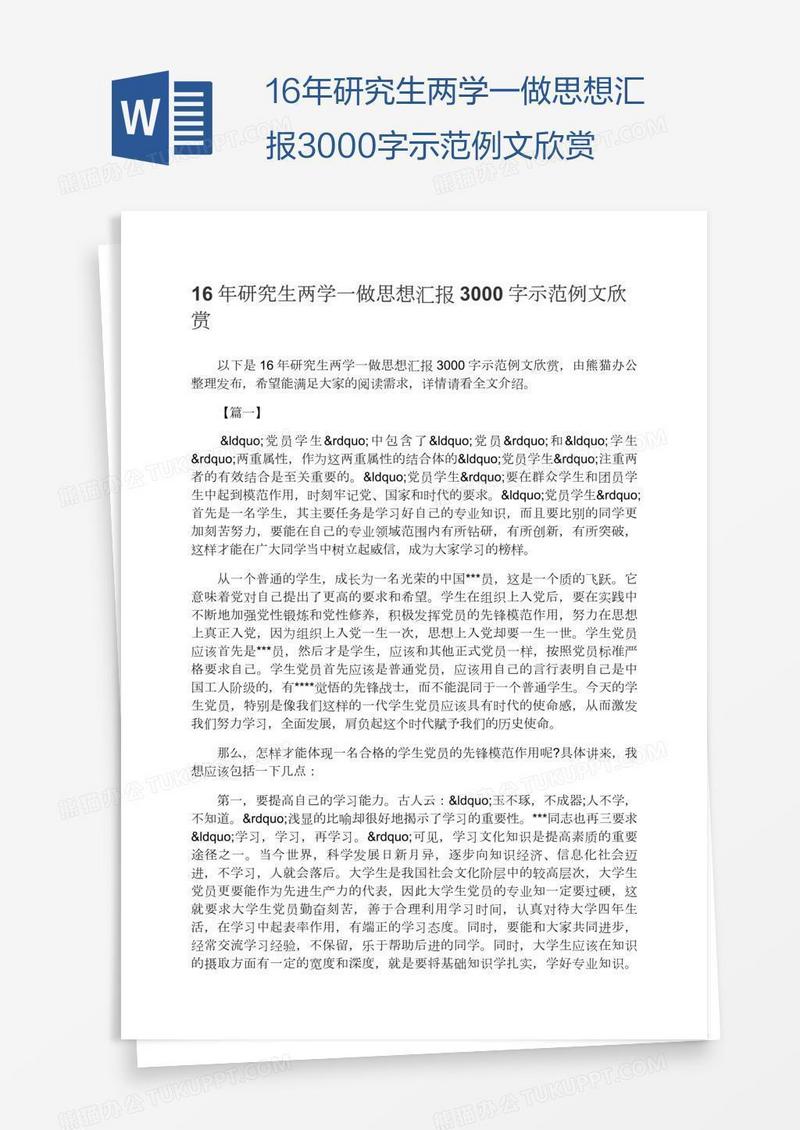 本作品为16年研究生两学一做思想汇报3000字示范例文欣赏, 编号:k1n2nl0e41, 格式为 docx, 大小1 MB, 本作品下载后,先解压,解压之后用推荐软件 Word(2010) 打开, 然后进行编辑功能。