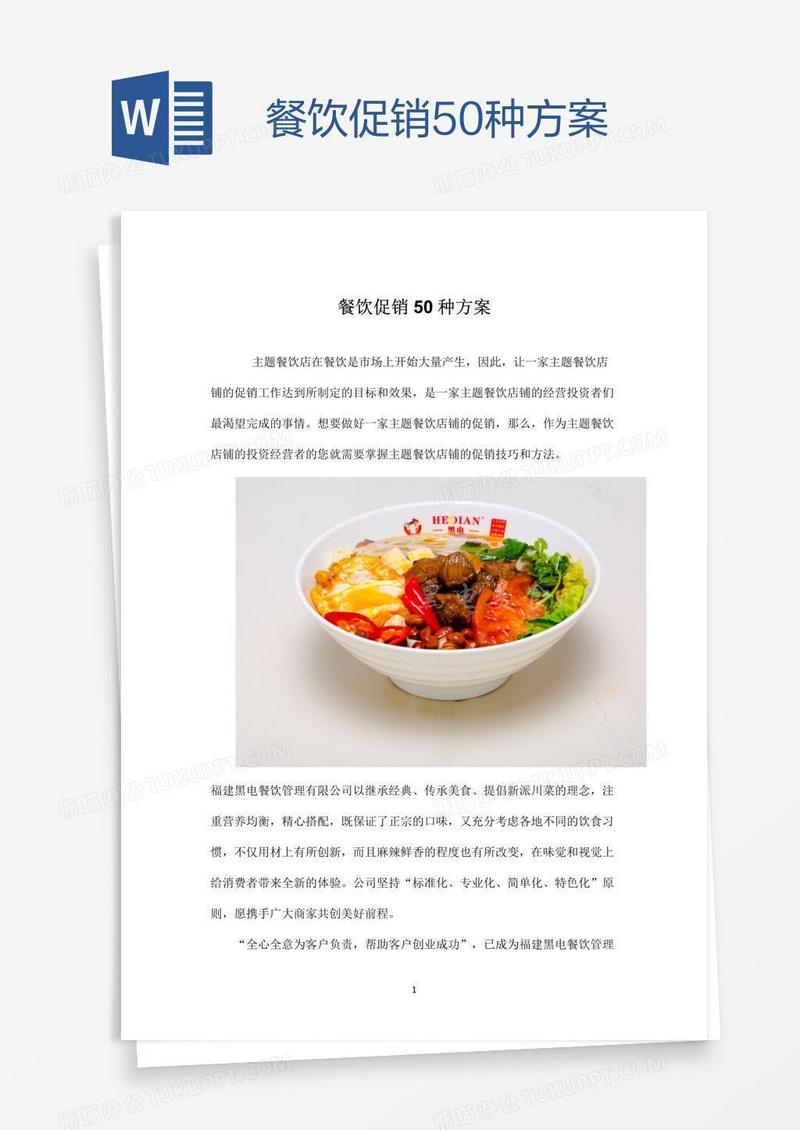 本作品为餐饮促销50种方案, 编号:k1n2nr8yp1, 格式为 docx, 大小2 MB, 本作品下载后,先解压,解压之后用推荐软件 Word(2010) 打开, 然后进行编辑功能。