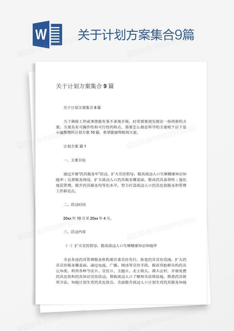 本作品为关于计划方案集合9篇, 编号:k1n2nvbm41, 格式为 docx, 大小1 MB, 本作品下载后,先解压,解压之后用推荐软件 Word(2010) 打开, 然后进行编辑功能。