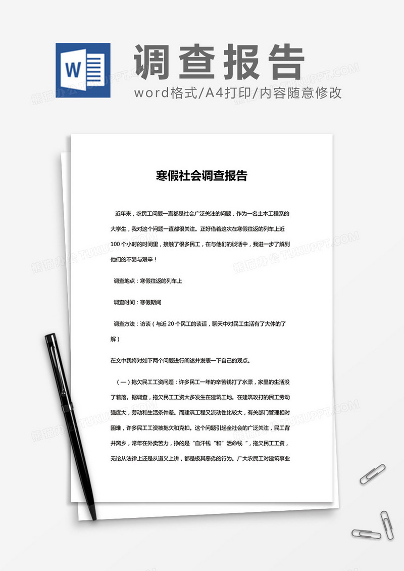 本作品为大学生寒假社会调查报告 Word模板, 编号:k9g548plj1, 格式为 docx, 大小1 MB, 本作品下载后,先解压,解压之后用推荐软件 Word(2016) 打开, 然后进行编辑功能。