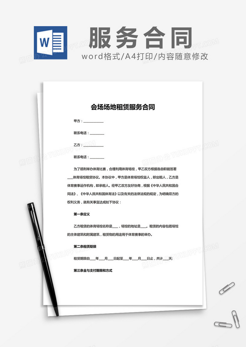 本作品为简约 会场场地租赁服务合同Word模版, 编号:k9g54gryj1, 格式为 docx, 大小1 MB, 本作品下载后,先解压,解压之后用推荐软件 Word(2019) 打开, 然后进行编辑功能。