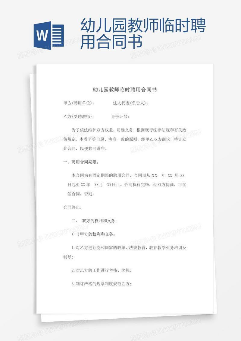 本作品为幼儿园教师临时聘用合同书, 编号:k9g54mpdv1, 格式为 doc, 大小1 MB, 本作品下载后,先解压,解压之后用推荐软件 Word(2010) 打开, 然后进行编辑功能。