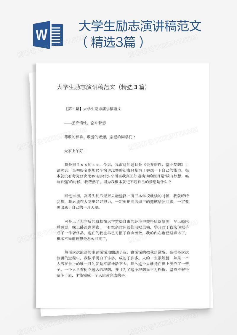 本作品为大学生励志演讲稿范文(精选3篇), 编号:k9g54p0mb1, 格式为 docx, 大小1 MB, 本作品下载后,先解压,解压之后用推荐软件 Word(2010) 打开, 然后进行编辑功能。
