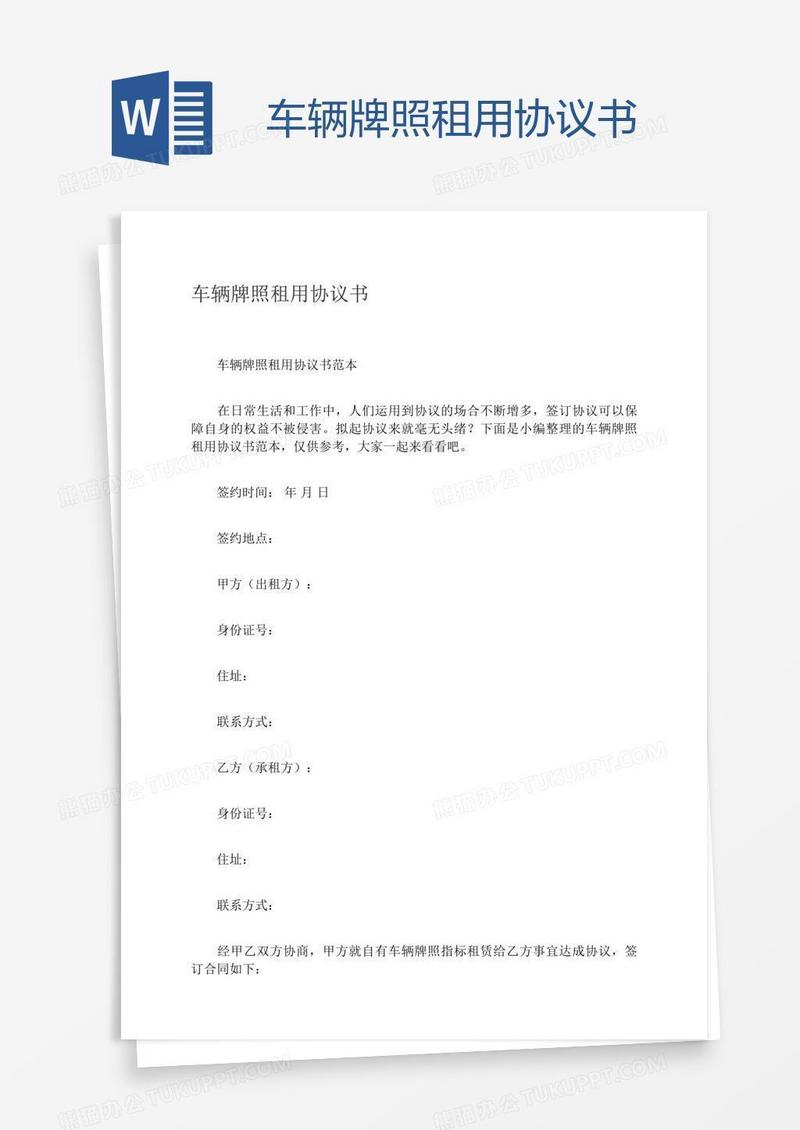本作品为车辆牌照租用协议书, 编号:k9g54qn641, 格式为 docx, 大小1 MB, 本作品下载后,先解压,解压之后用推荐软件 Word(2010) 打开, 然后进行编辑功能。