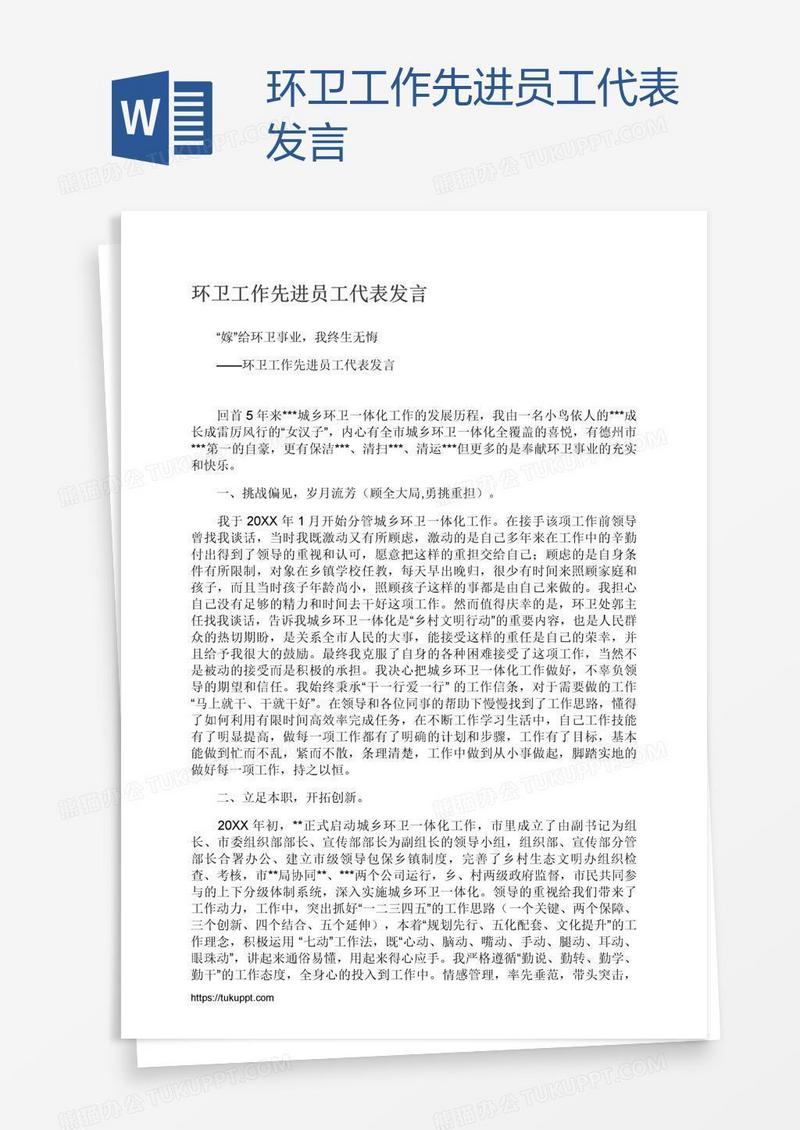 本作品为环卫工作先进员工代表发言, 编号:k9g5k0r741, 格式为 docx, 大小1 MB, 本作品下载后,先解压,解压之后用推荐软件 Word(2010) 打开, 然后进行编辑功能。