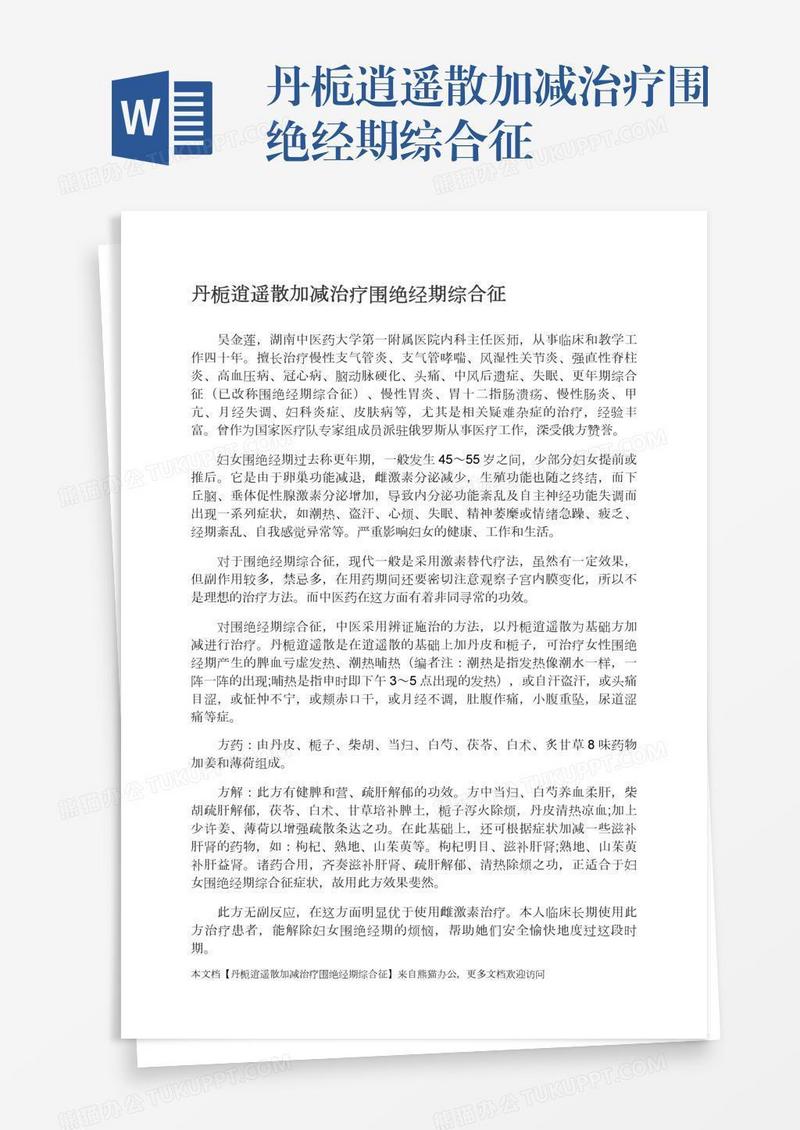 本作品为丹栀逍遥散加减治疗围绝经期综合征, 编号:k9g5k3dkb1, 格式为 docx, 大小1 MB, 本作品下载后,先解压,解压之后用推荐软件 Word(2010) 打开, 然后进行编辑功能。