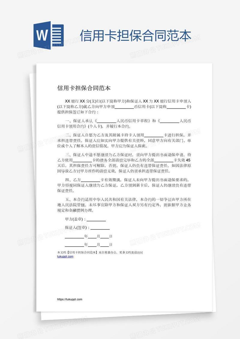 本作品为信用卡担保合同范本, 编号:k9g5k44b81, 格式为 docx, 大小1 MB, 本作品下载后,先解压,解压之后用推荐软件 Word(2010) 打开, 然后进行编辑功能。