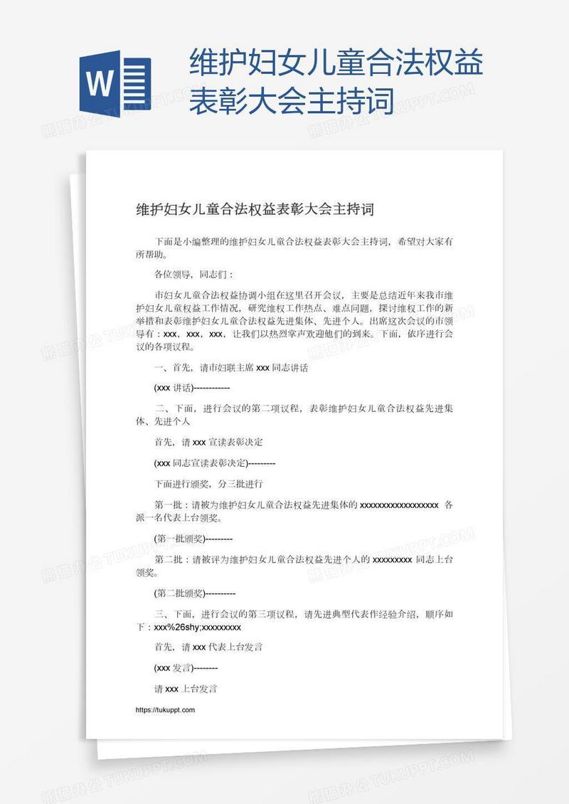 本作品为维护妇女儿童合法权益表彰大会主持词, 编号:k9g5kgl6v1, 格式为 docx, 大小1 MB, 本作品下载后,先解压,解压之后用推荐软件 Word(2010) 打开, 然后进行编辑功能。