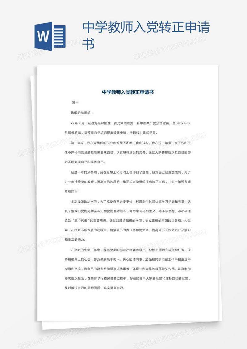 本作品为中学教师入党转正申请书, 编号:k9g5kjdbv1, 格式为 docx, 大小1 MB, 本作品下载后,先解压,解压之后用推荐软件 Word(2010) 打开, 然后进行编辑功能。