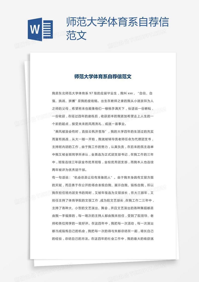 本作品为师范大学体育系自荐信范文, 编号:k9g5kmqr41, 格式为 docx, 大小1 MB, 本作品下载后,先解压,解压之后用推荐软件 Word(2010) 打开, 然后进行编辑功能。