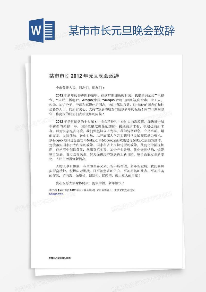 本作品为某市市长元旦晚会致辞, 编号:k9g5koqbv1, 格式为 docx, 大小1 MB, 本作品下载后,先解压,解压之后用推荐软件 Word(2010) 打开, 然后进行编辑功能。