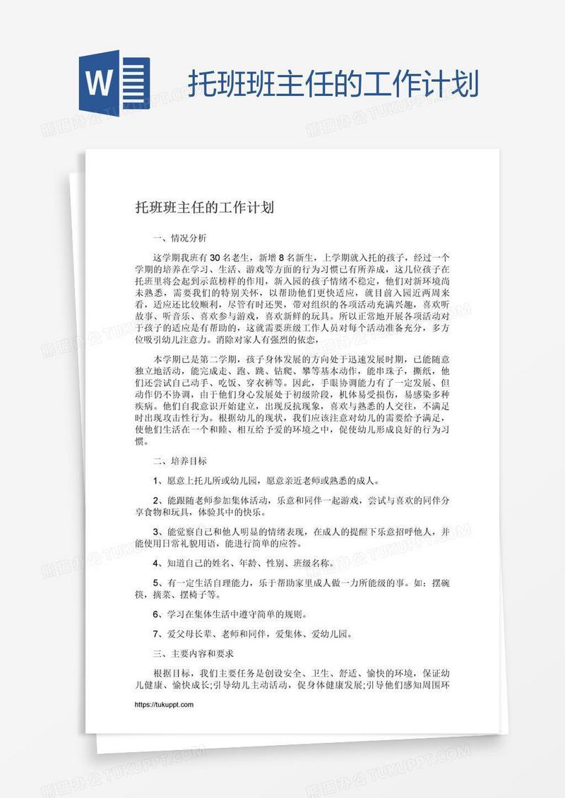 本作品为托班班主任的工作计划, 编号:k9g5kv8gb1, 格式为 docx, 大小1 MB, 本作品下载后,先解压,解压之后用推荐软件 Word(2010) 打开, 然后进行编辑功能。