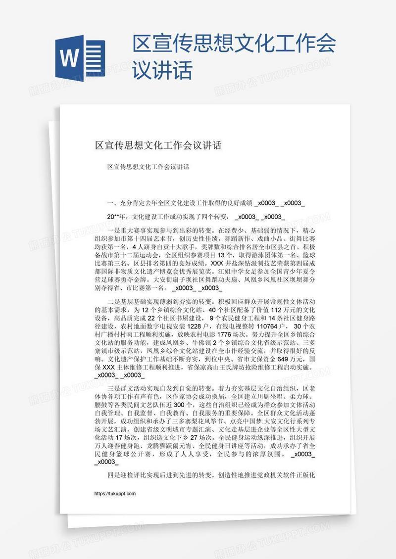 本作品为区宣传思想文化工作会议讲话, 编号:k9g5kweob1, 格式为 docx, 大小1 MB, 本作品下载后,先解压,解压之后用推荐软件 Word(2010) 打开, 然后进行编辑功能。