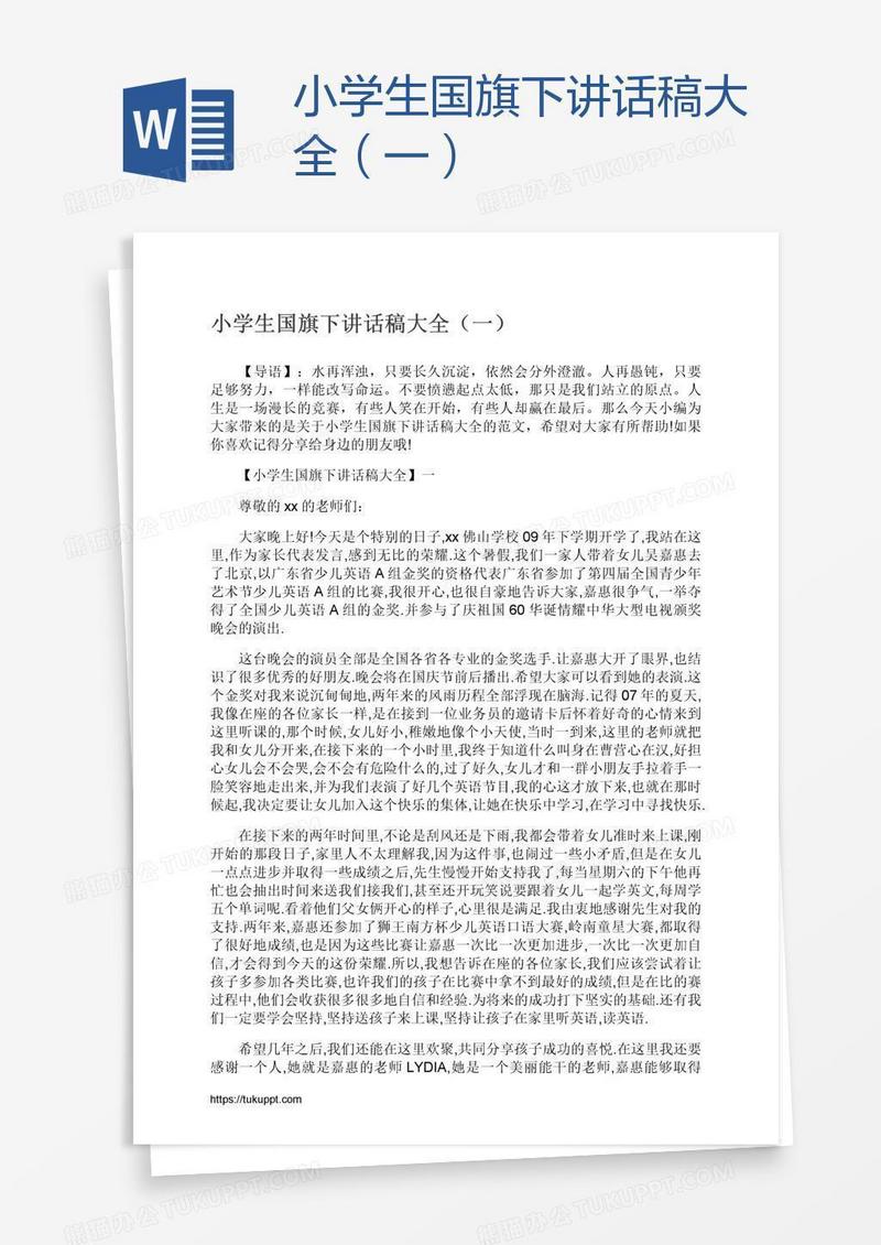 本作品为小学生国旗下讲话稿大全(一), 编号:k9g5kyjk81, 格式为 docx, 大小1 MB, 本作品下载后,先解压,解压之后用推荐软件 Word(2010) 打开, 然后进行编辑功能。