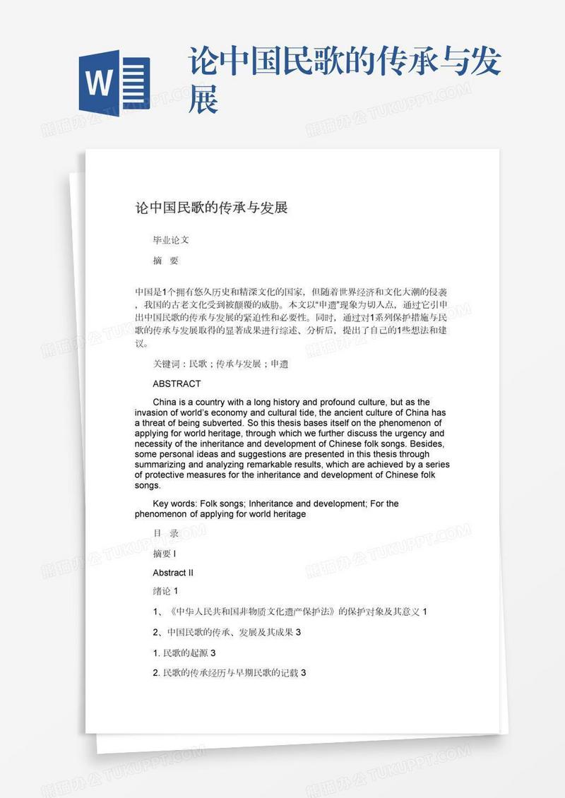 本作品为论中国民歌的传承与发展, 编号:k9g5l07wv1, 格式为 docx, 大小1 MB, 本作品下载后,先解压,解压之后用推荐软件 Word(2010) 打开, 然后进行编辑功能。