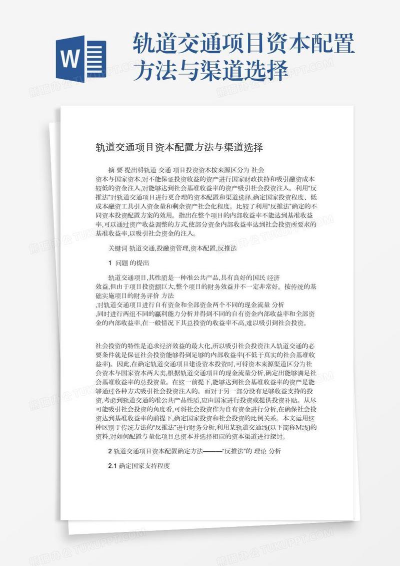 本作品为轨道交通项目资本配置方法与渠道选择, 编号:k9g5l4k7b1, 格式为 docx, 大小1 MB, 本作品下载后,先解压,解压之后用推荐软件 Word(2010) 打开, 然后进行编辑功能。