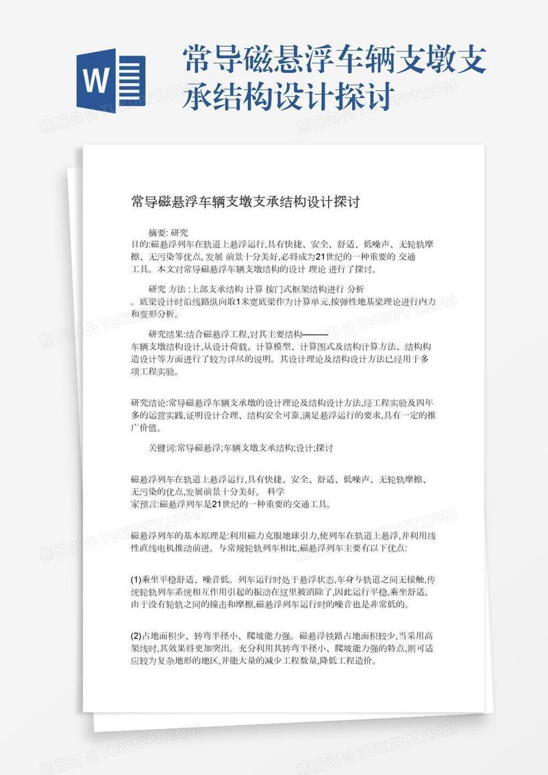 本作品为常导磁悬浮车辆支墩支承结构设计探讨, 编号:k9g5l4kkj1, 格式为 docx, 大小1 MB, 本作品下载后,先解压,解压之后用推荐软件 Word(2010) 打开, 然后进行编辑功能。