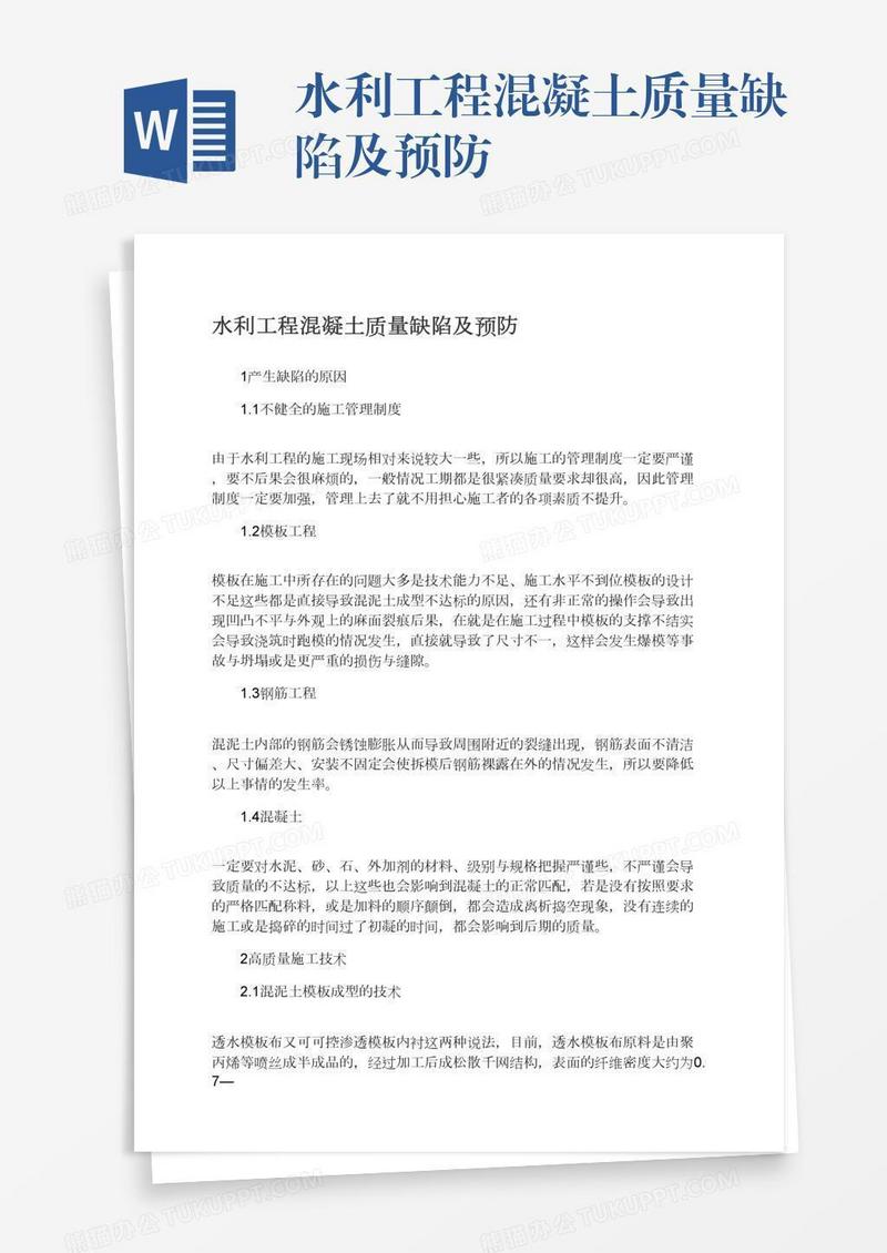 本作品为水利工程混凝土质量缺陷及预防, 编号:k9g5lkwm41, 格式为 docx, 大小1 MB, 本作品下载后,先解压,解压之后用推荐软件 Word(2010) 打开, 然后进行编辑功能。