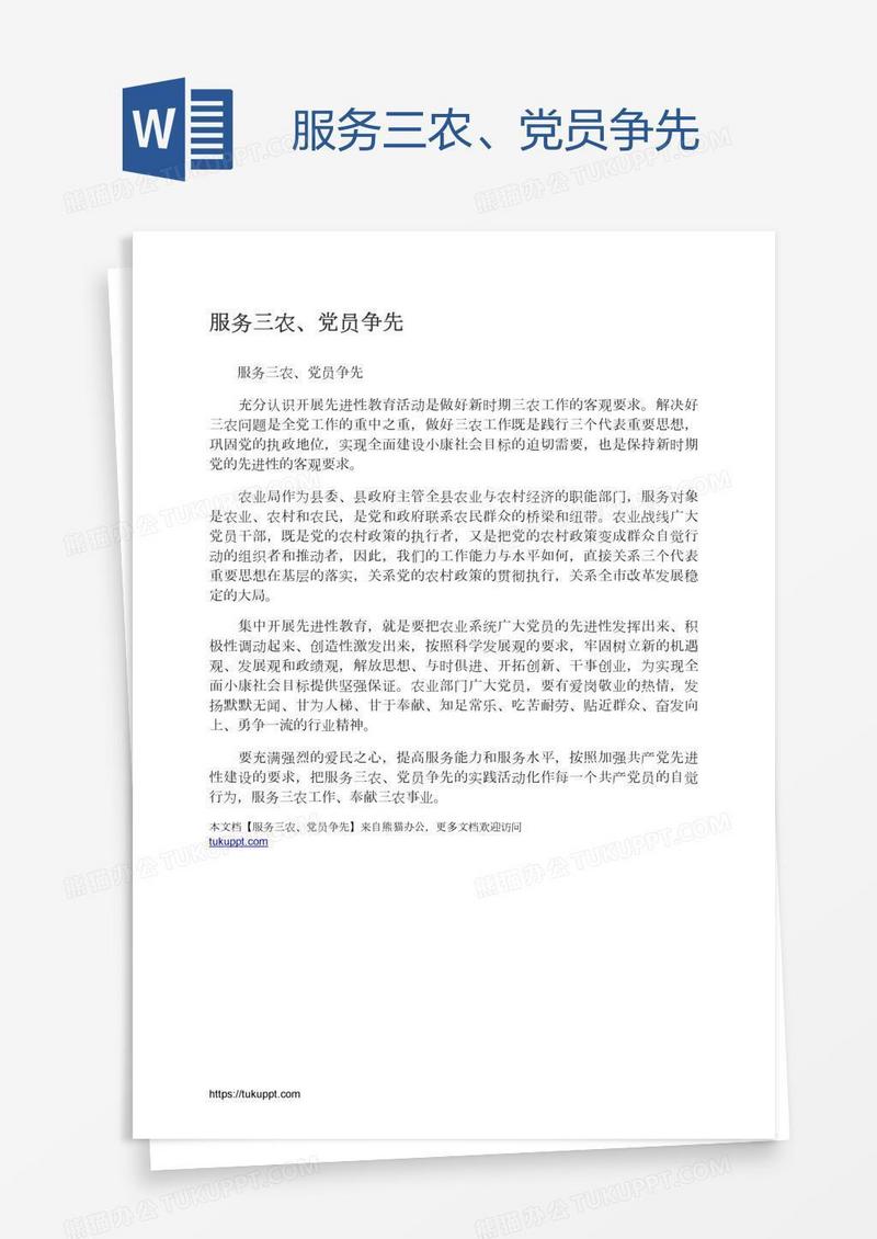 本作品为服务三农、党员争先, 编号:o12ym0q8m9, 格式为 docx, 大小1 MB, 本作品下载后,先解压,解压之后用推荐软件 Word(2010) 打开, 然后进行编辑功能。