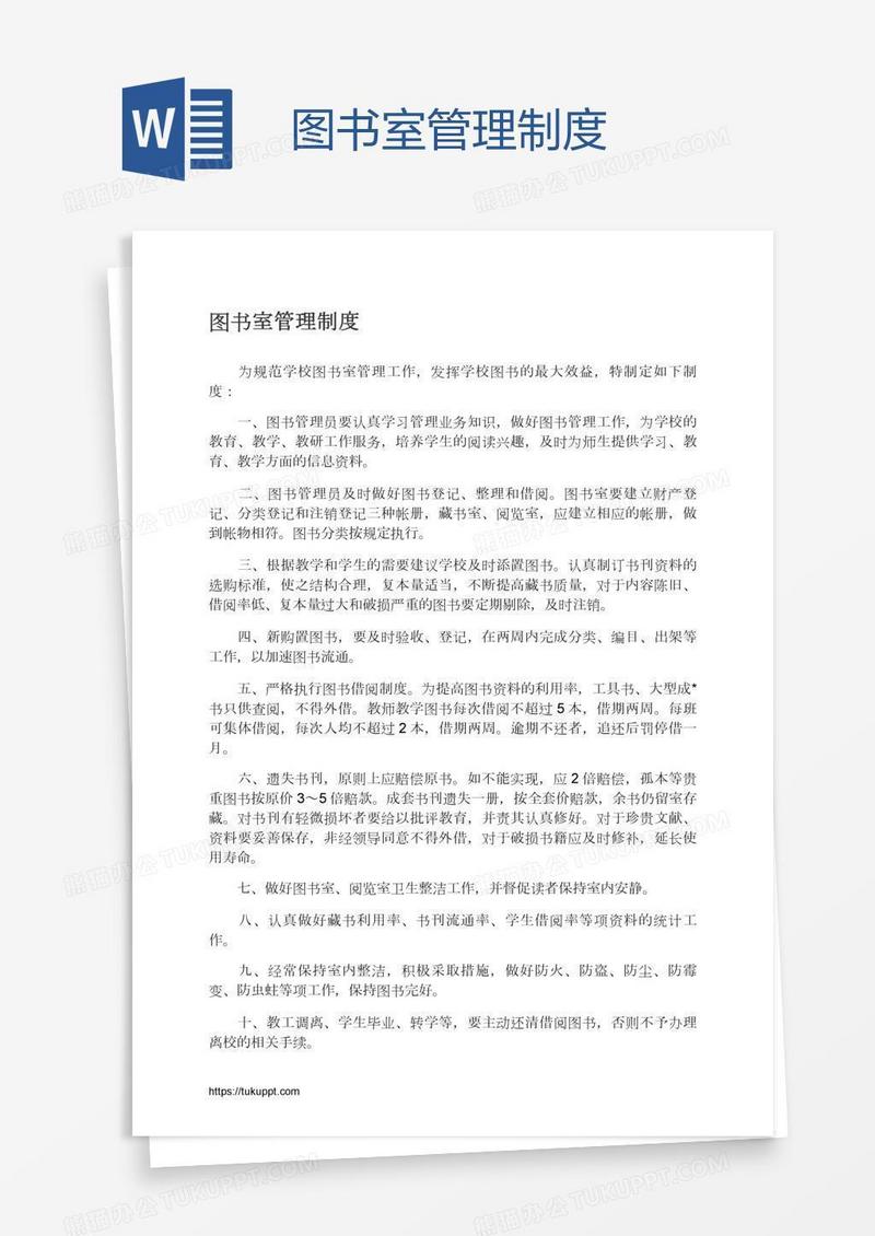 本作品为图书室管理制度, 编号:o12ym0vkm9, 格式为 docx, 大小1 MB, 本作品下载后,先解压,解压之后用推荐软件 Word(2010) 打开, 然后进行编辑功能。