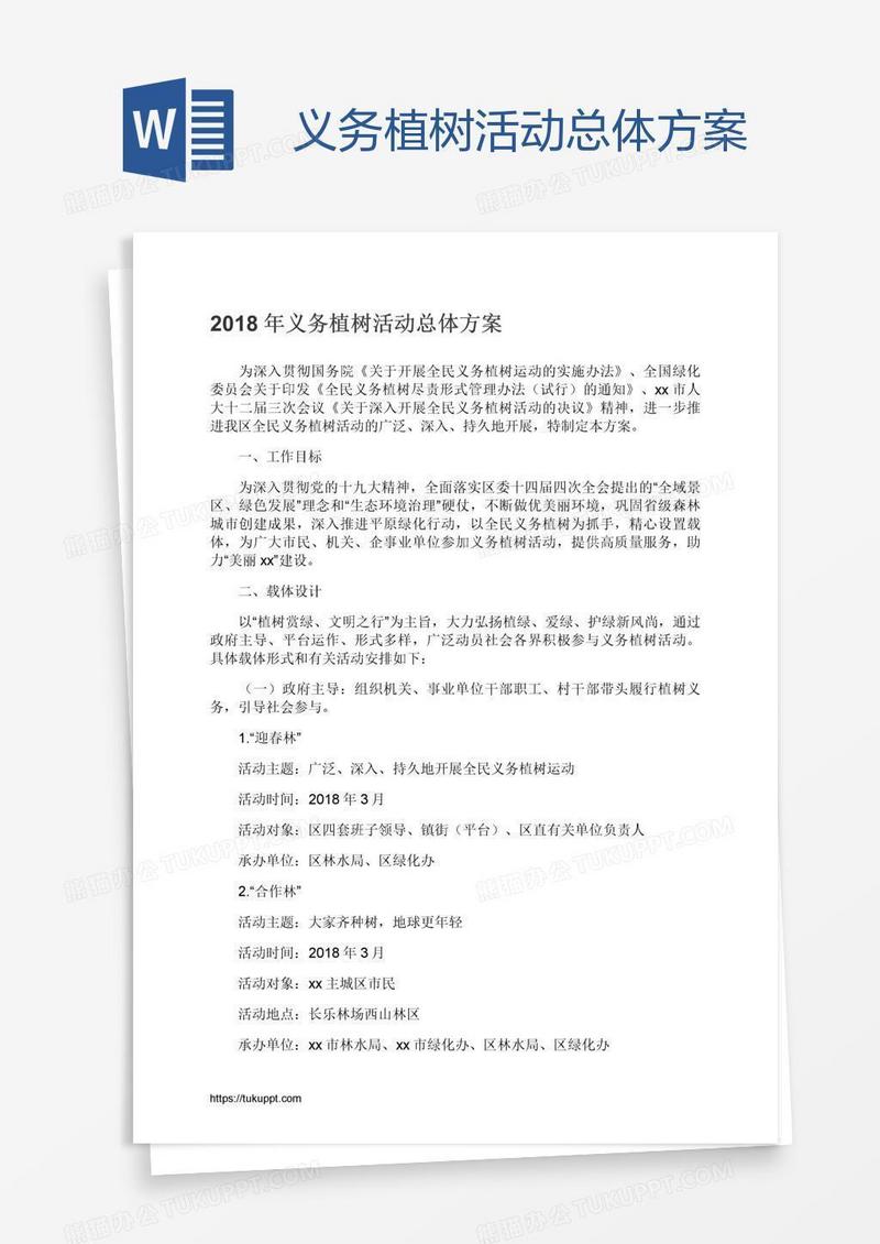 本作品为义务植树活动总体方案, 编号:o12ym2wn49, 格式为 docx, 大小1 MB, 本作品下载后,先解压,解压之后用推荐软件 Word(2010) 打开, 然后进行编辑功能。