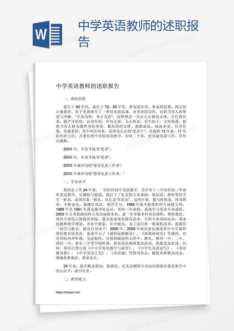 本作品为中学英语教师的述职报告, 编号:o12ym8vdm9, 格式为 docx, 大小1 MB, 本作品下载后,先解压,解压之后用推荐软件 Word(2010) 打开, 然后进行编辑功能。