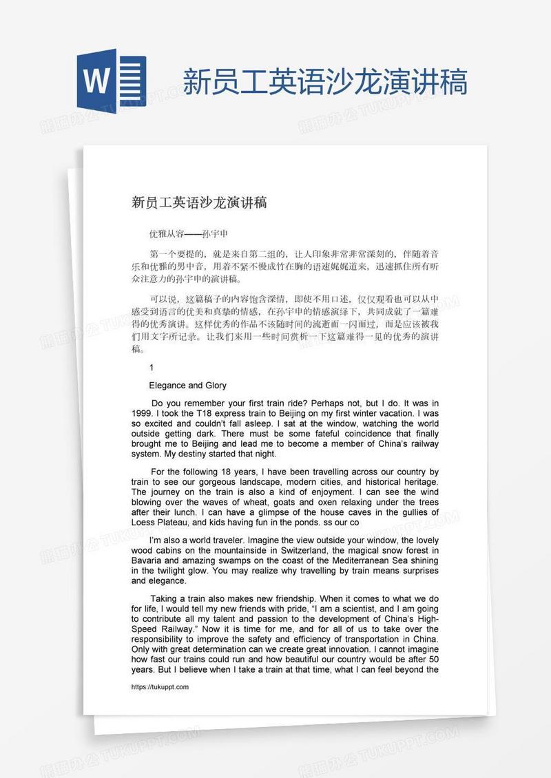 本作品为新员工英语沙龙演讲稿, 编号:o12ymjnb49, 格式为 docx, 大小1 MB, 本作品下载后,先解压,解压之后用推荐软件 Word(2010) 打开, 然后进行编辑功能。