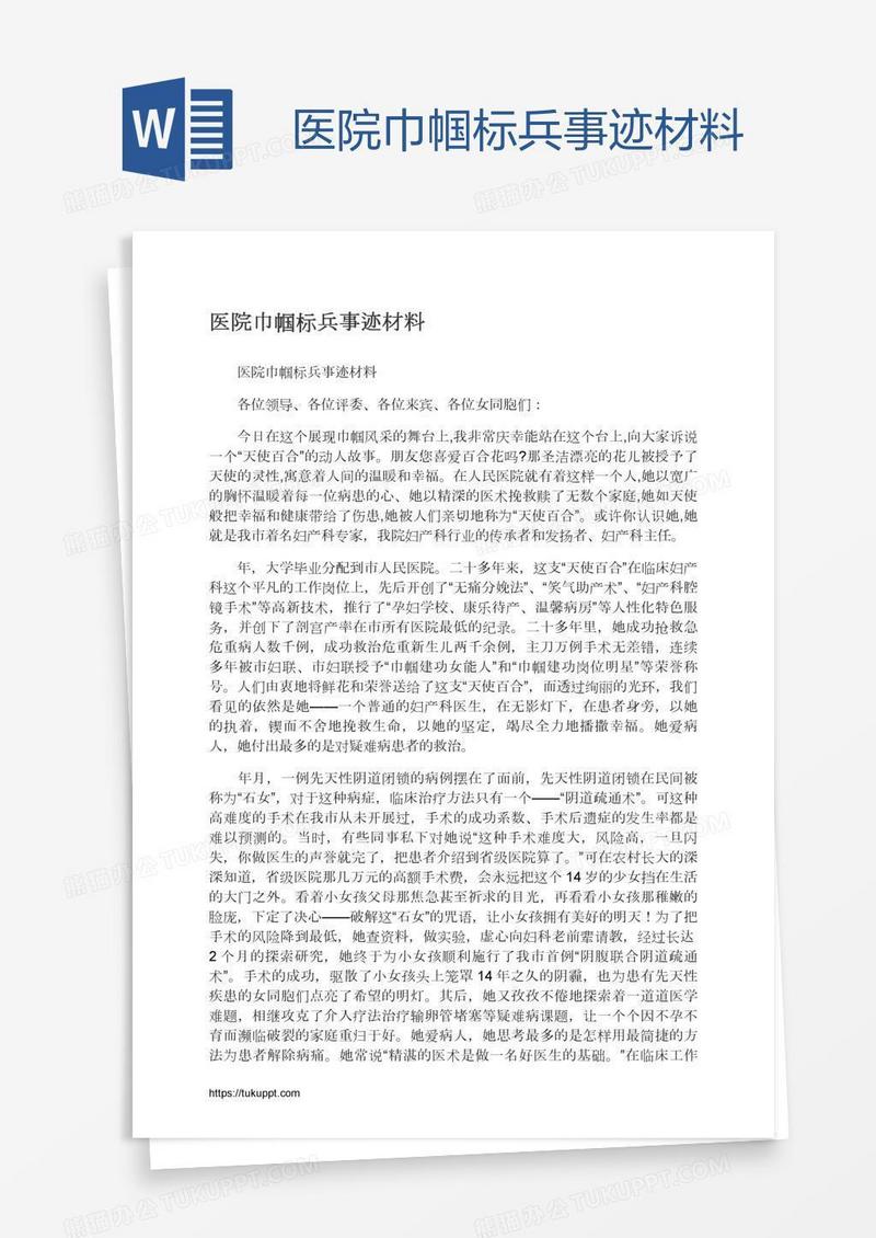 本作品为医院巾帼标兵事迹材料, 编号:o12ymlmnj9, 格式为 docx, 大小1 MB, 本作品下载后,先解压,解压之后用推荐软件 Word(2010) 打开, 然后进行编辑功能。