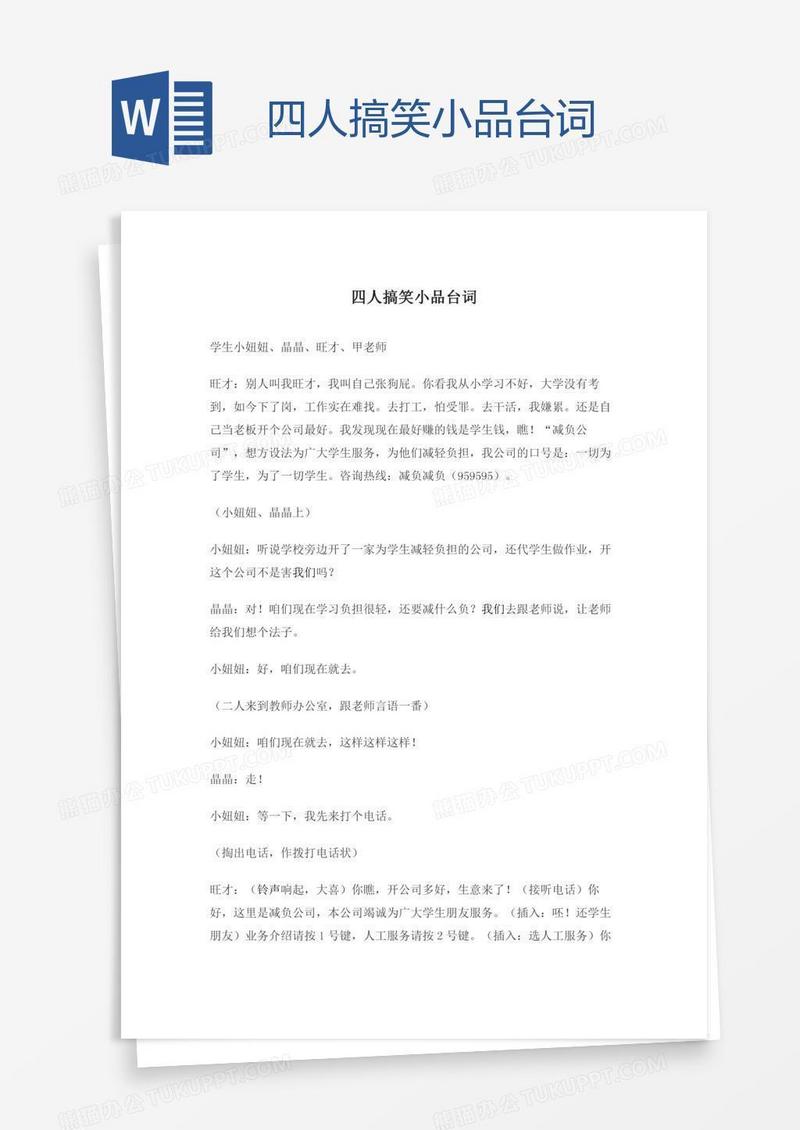 本作品为四人搞笑小品台词, 编号:o12ymronq9, 格式为 docx, 大小1 MB, 本作品下载后,先解压,解压之后用推荐软件 Word(2010) 打开, 然后进行编辑功能。