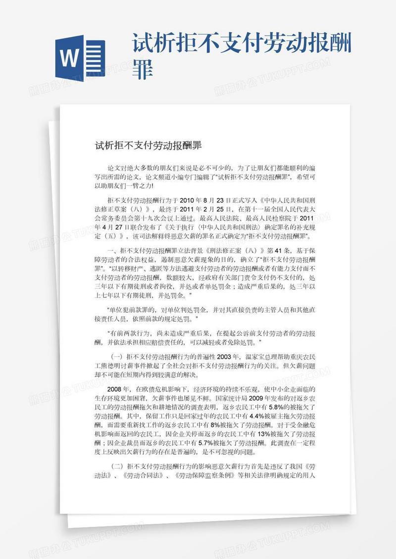 本作品为试析拒不支付劳动报酬罪, 编号:o12ymvglq9, 格式为 docx, 大小1 MB, 本作品下载后,先解压,解压之后用推荐软件 Word(2010) 打开, 然后进行编辑功能。